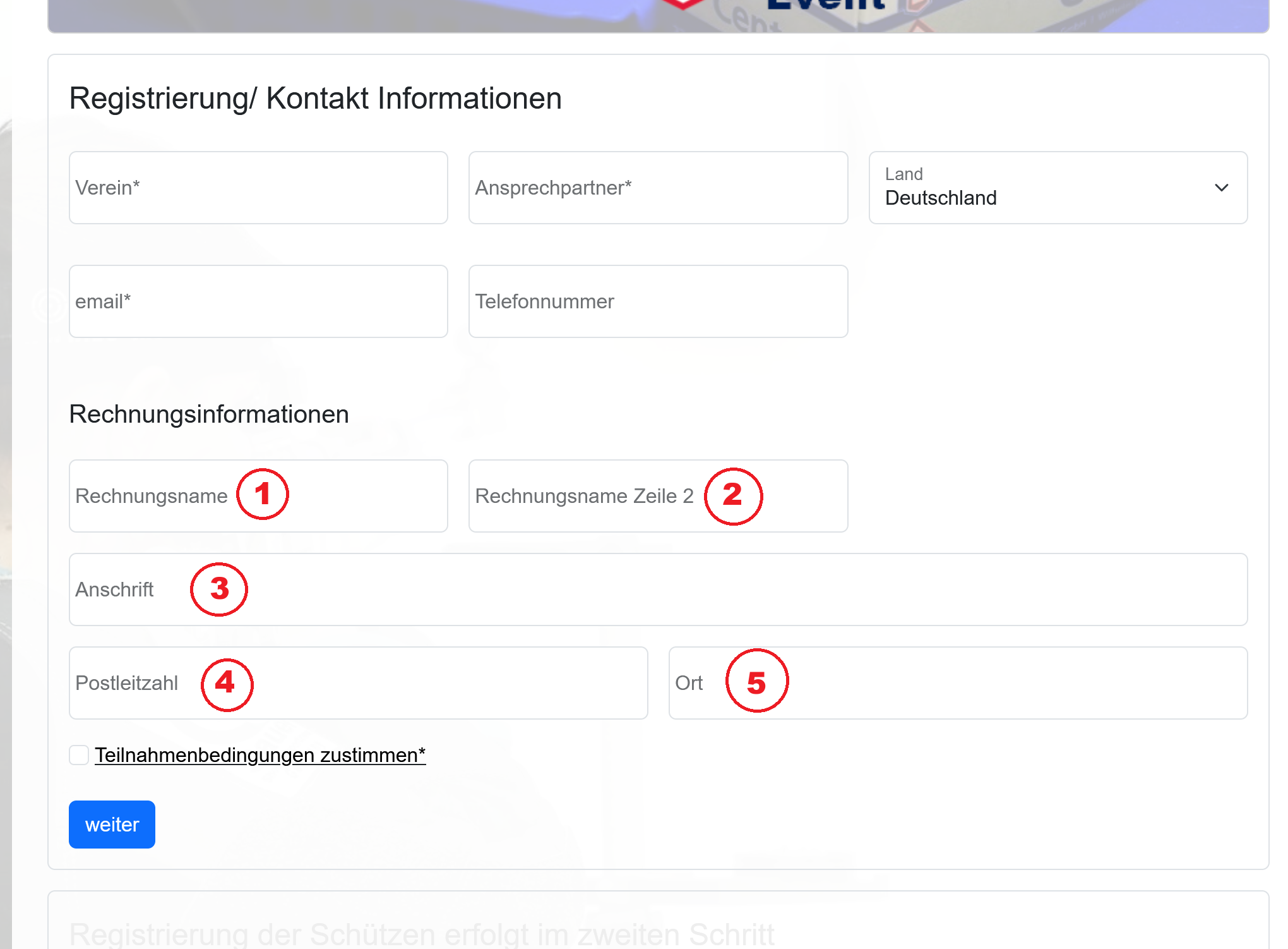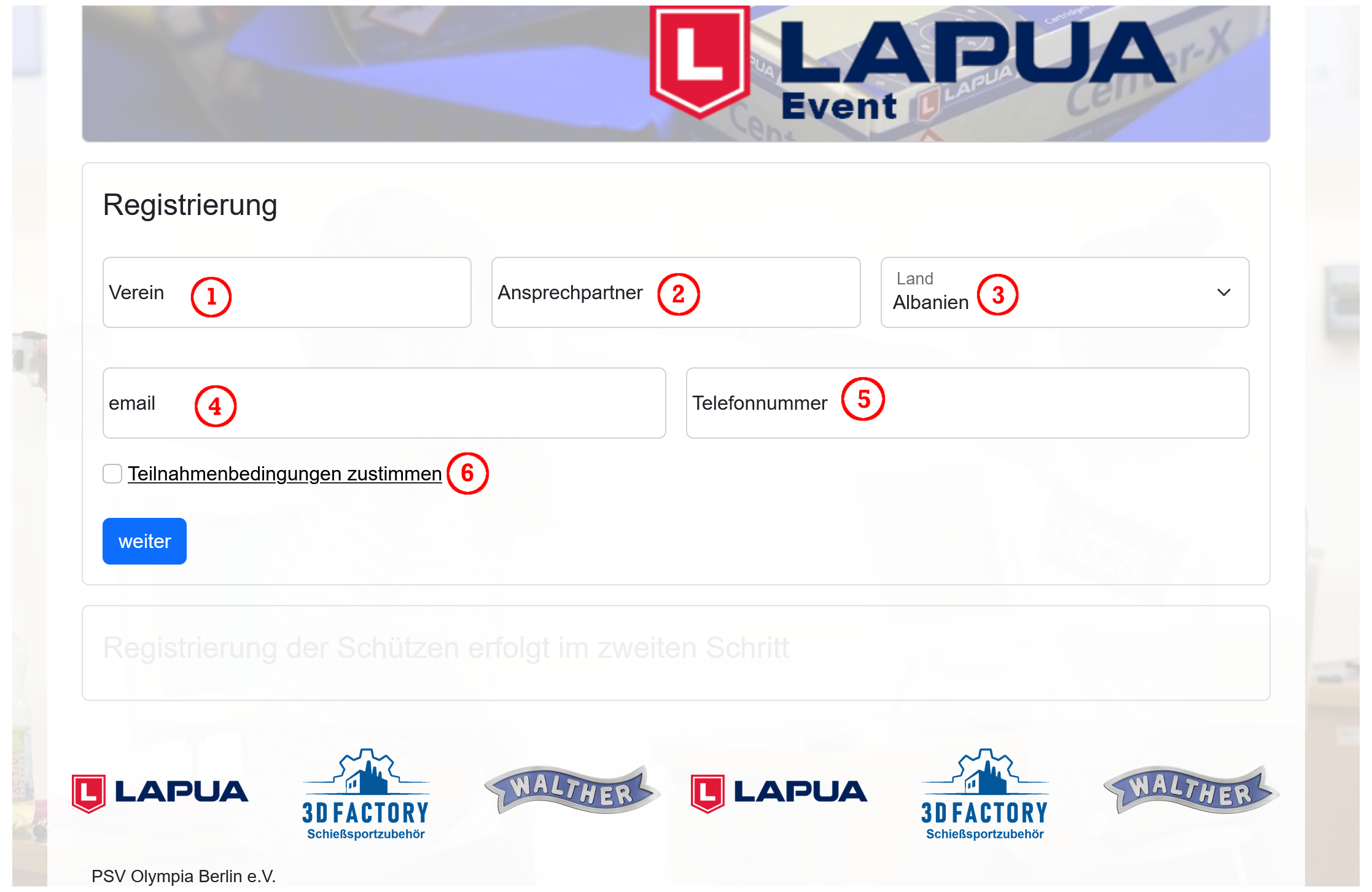 Im ersten Schritt der Anmeldung erfolgt die Registrierung des Ansprechpartners. Den benötigen wir falls wir Rückfragen zu den registrierten Schützen haben. Tragt dort bitte