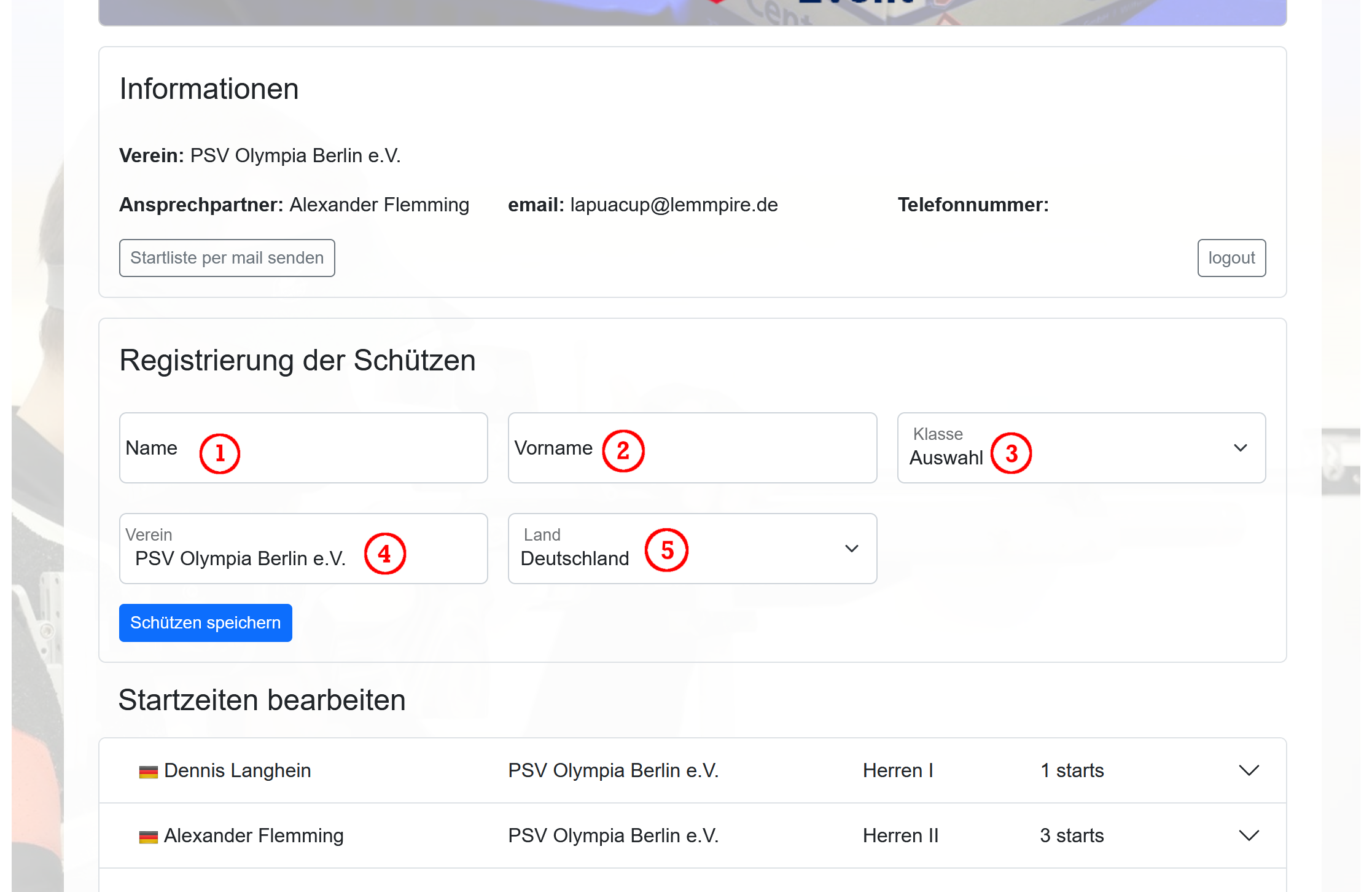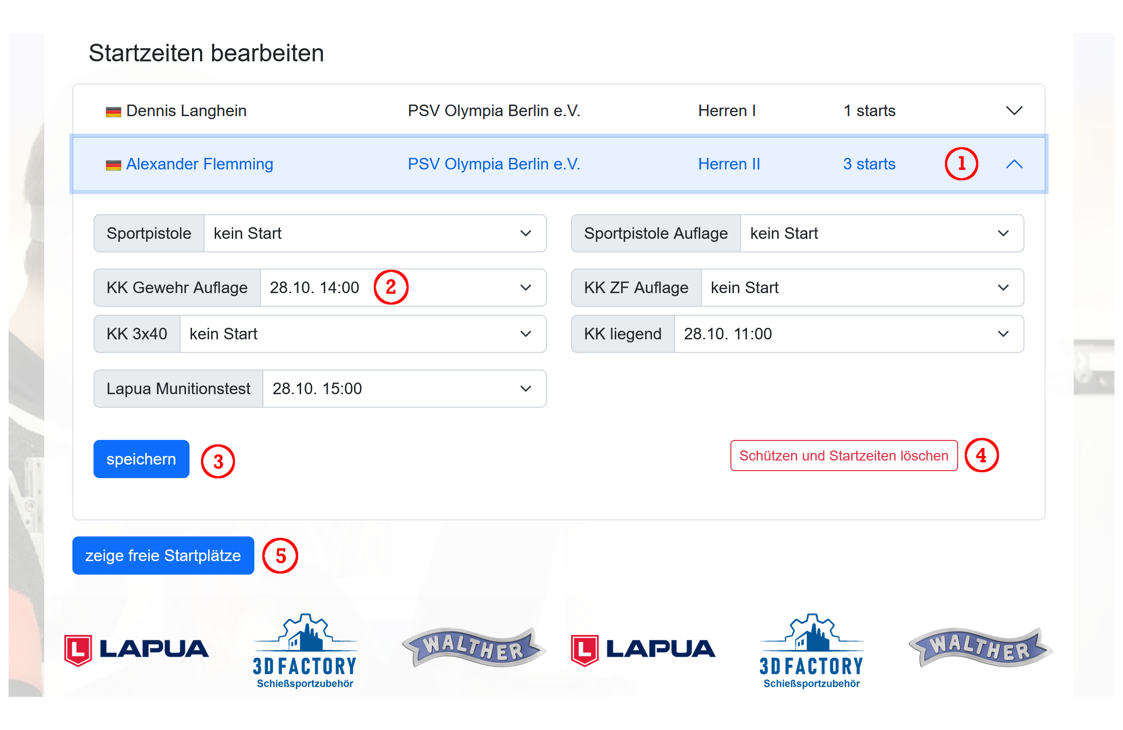 Die Startzeiten (2) können hier gewählt und dann gespeichert (3) werden. Bis zum Meldeschluss ist es jederzeit möglich die Startzeiten anzupassen oder den Schützen zu löschen (4). Die Anzahl der freien Startplätze (5) geben dir die Möglichkeit Wettkämpfe besser planen zu können.