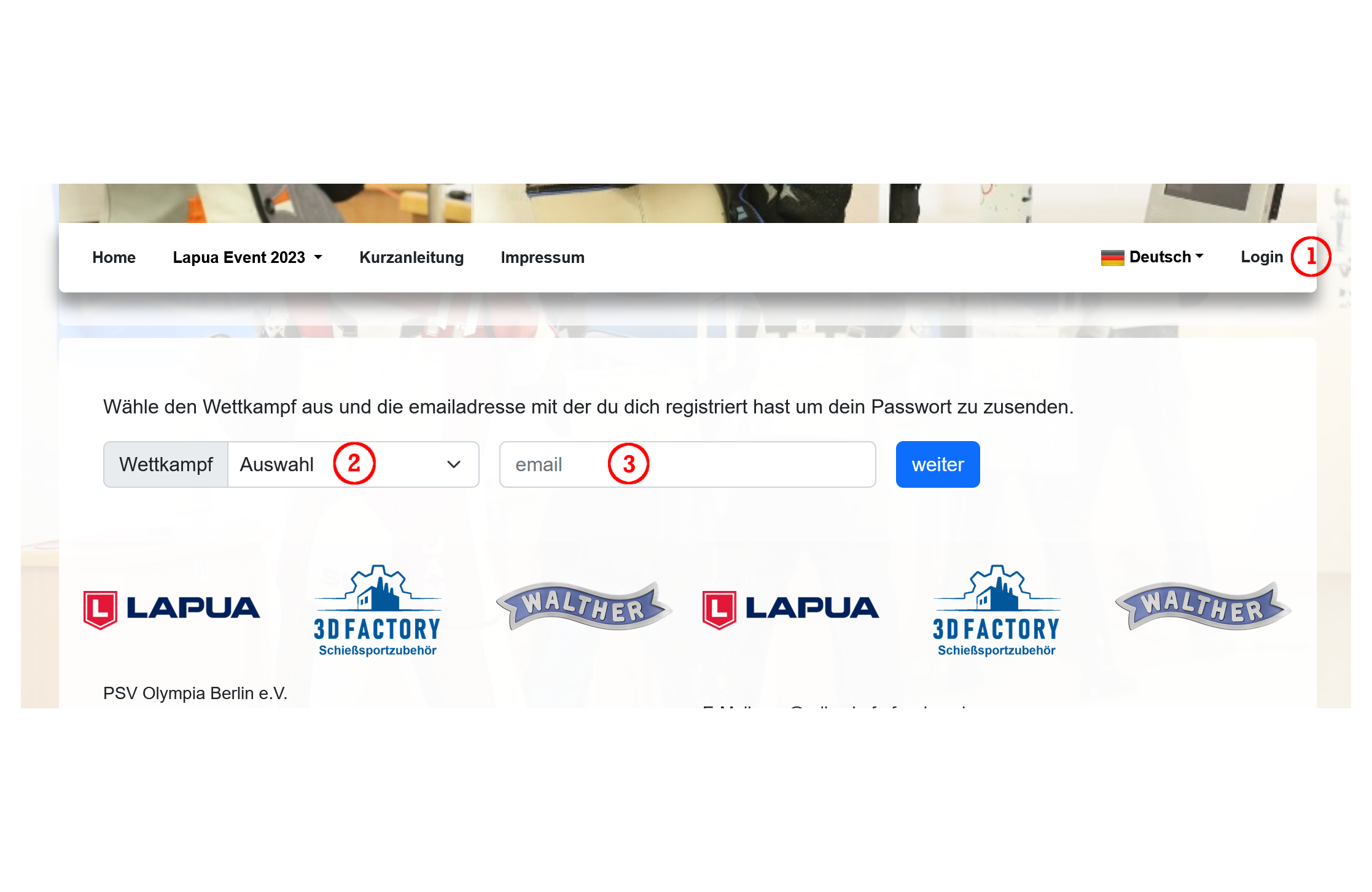 Gebt dort den Wettkampf (2) an und die email (3) mit der ihr euch registriert habt an.