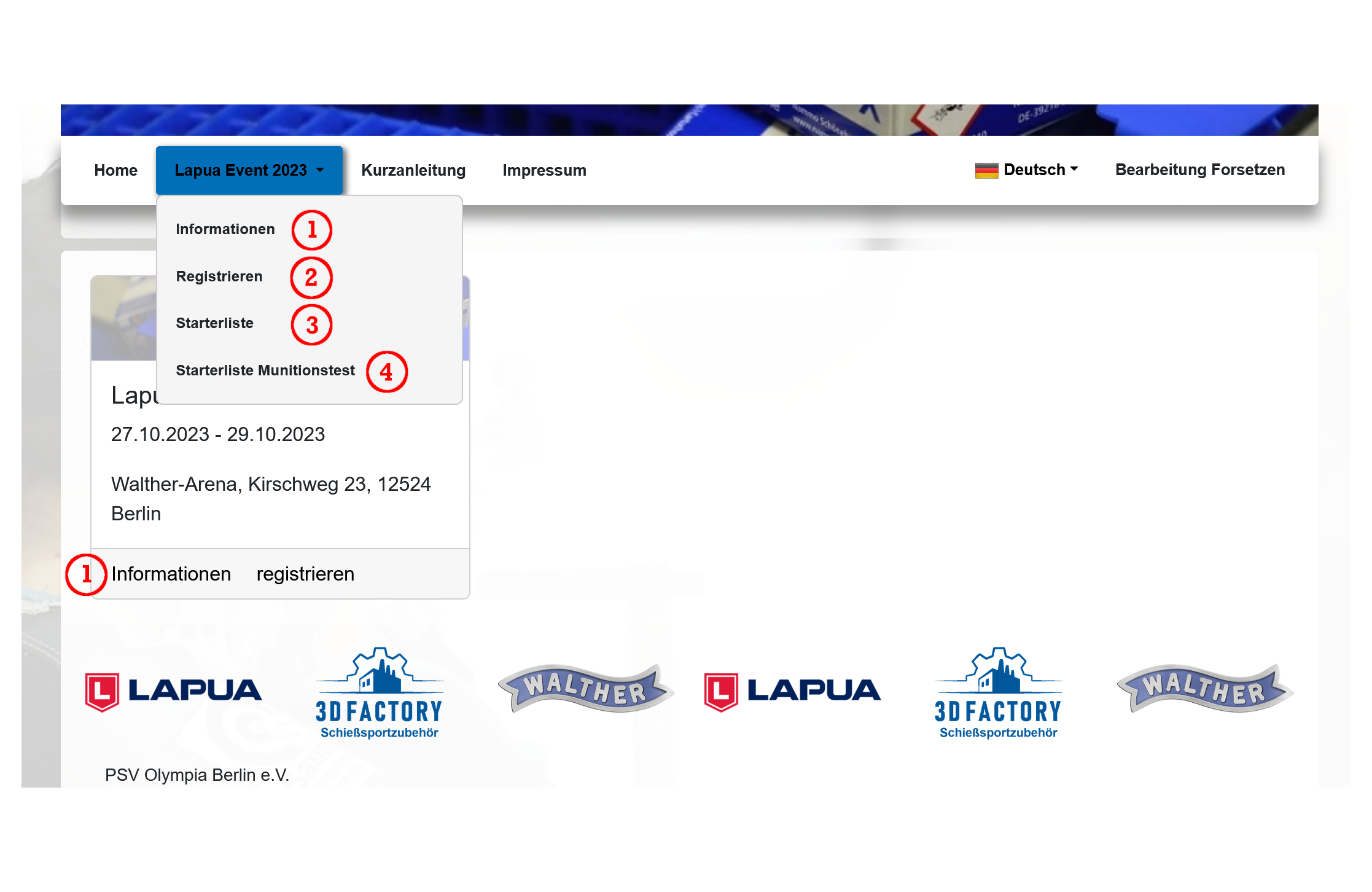 es folgt eine Kurzanleitung zur Registrierung für einen Wettkampf. Die gespeicherten Daten (Vereine/Schützen/Startzeiten) werden nach dem Wettkampf gelöscht, das macht es erforderlich sich für jeden Wettkampf neu zu registrieren.